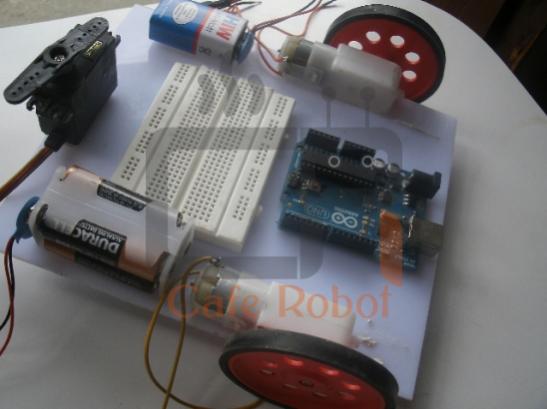 در ابتدا سیم های برد بورد را به موتور های دنده ای لحیم کنید. این کار اتصال موتور ها را به برد بورد آسان تر می کند.سپس چرخ ها را بوسیله ی پیچ به شافت موتور متصل کنید. سپس چرخ کاستور را به ناحیه زیر صفحه و در جلوی ربات و قسمت وسط توسط چسب های دو طرفه بچسبانید. این چرخ ها می توانند حول یک محور عمودی چرخش نمایند.