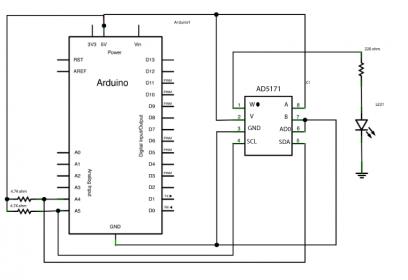 پین های 3 ، 6 و 7 از AD5171 را به زمین ، و پین های 2 و 8 به +5V متصل کنید. پین 4 ،پین کلاک پتانسیومتر دیجیتال (SCL) را به پین 5 آنالوگ روی آردینو ، و پین 5، خط(Line) داده (SDA) ، به پین 4 آنالوگ (آدرینو) متصل کنید. به هر دو خطوط SCL و SDA ، مقاومت بالاکش