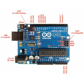 برد آردوینو Uno بر پایه میکروکنترلر ATmega328 می باشد.(32 كیلوبایت flash ، 2 كیلوبایت sram و 1كیلوبایت eeprom ) این برد 14 پین ورودی و خروجی دیجیتال (که 6 تای آن می تواند به عنوان خروجی PWM استفاده گردد)، 6 ورودی آنالوگ، یک كریستال16مگاهرتز ، یک پورت USB، یک پاورجک (ورودی منبع تغذیه)، یک ICSP header و یک دکمه ریست دارد. برد Uno شامل کلیه امکانات مورد نیاز جهت بکارگیری میکروکنترلر موجود بر روی برد می باشد. برای شروع تنها با یک کابل USB، به سـادگی برد را به کامپیوترتان متصـل کنید و یـا آن را با یـک آداپـتور AC-To-DC و یا باتری راه اندازی نمایید.