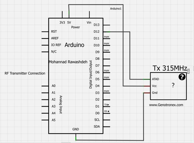 کد:#include <VirtualWire.h> char *controller; void setup() { pinMode(13,OUTPUT); vw_set_ptt_inverted(true); // vw_set_tx_pin(12); vw_setup(4000);// speed of data transfer Kbps } void loop(){ controller="1" ; vw_send((uint8_t *)controller, strlen(controller)); vw_wait_tx(); // Wait until the whole message is gone digitalWrite(13,1); delay(2000); controller="0" ; vw_send((uint8_t *)controller, strlen(controller)); vw_wait_tx(); // Wait until the whole message is gone digitalWrite(13,0); delay(2000); }