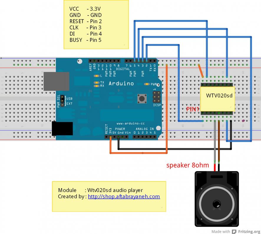با استفاده از ماژول WTV020-SD در کنار برد آردوینو ، پروژه شما می تواند به راحتی به یک پروژه سخنگو تبدیل شود ، فقط کافی است هشدار ها و محتوای صوتی خود را با استفاده از کامپیوتر با فرمت ام پی تیری یا ویو ( .wav - .mp3 ) ضبط نموده و با کمک مبدل ارائه شده، آن را به فرمت AD4 تبدیل نمایید، سپس فایل ها را درون یک کارت حافظه میکرو اس دی کپی نمایید و کارت را درون ماژول قرار دهید، پس از اتصال ماژول به آردوینو ، با استفاده از توابع کتابخانه ای موجود و کمی کد نویسی به راحتی می توانید هر یک از فایل های صوتی موجود در کارت حافظه را پخش نمایید. فقط توجه داشته باشید در زمان نامگذاری فایل های صوتی در کارت حافظه از 0000 تا 9999 استفاده نمایید . به عنوان نمونه 0000.AD4 و 0001.AD4. در نهایت برای بخش فایل کافی است نام آن را بدون صفرهای پشت آن صدا بزنید، به عنوان مثال playVoice(0)