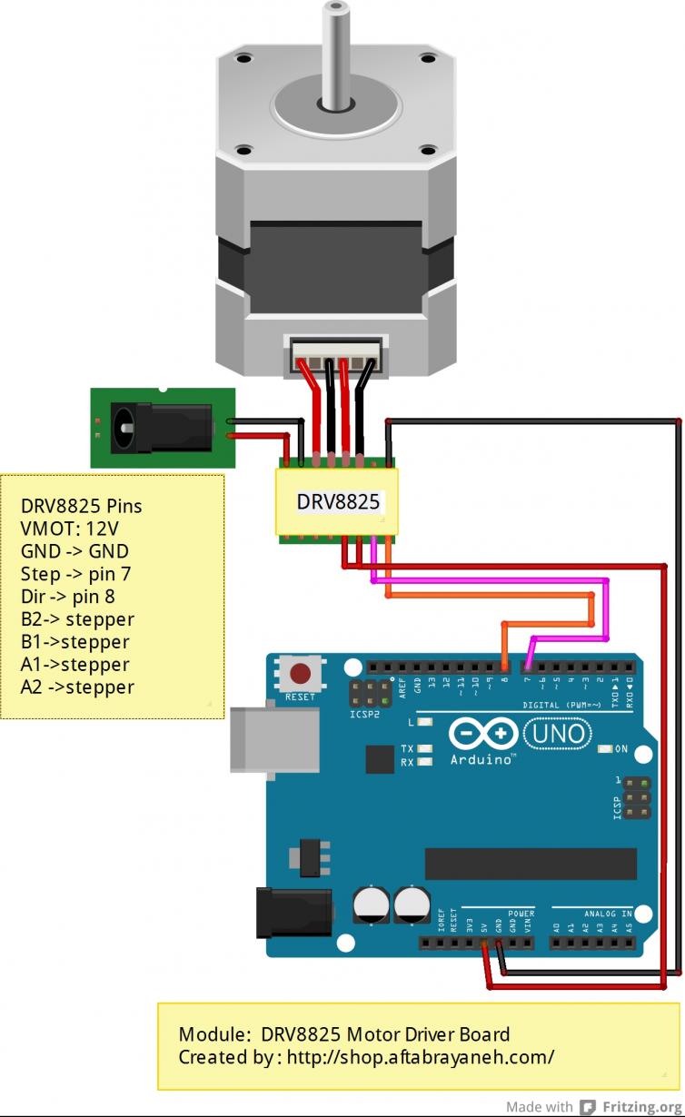 مثال زیر راه اندازی استپر را توسط ماژول DRV8825 متصل به آردینو نشان می دهد.