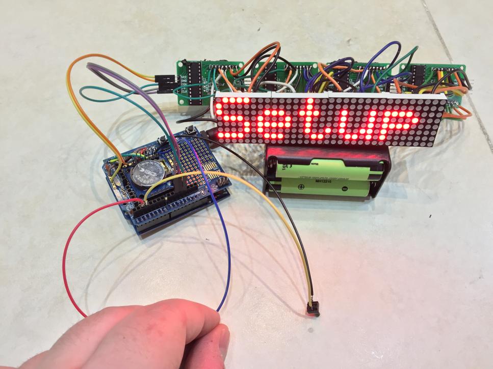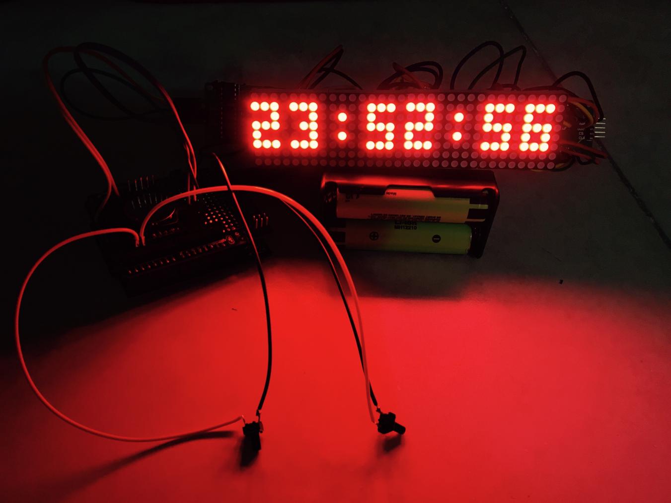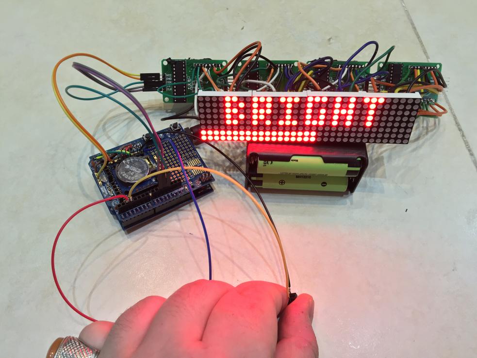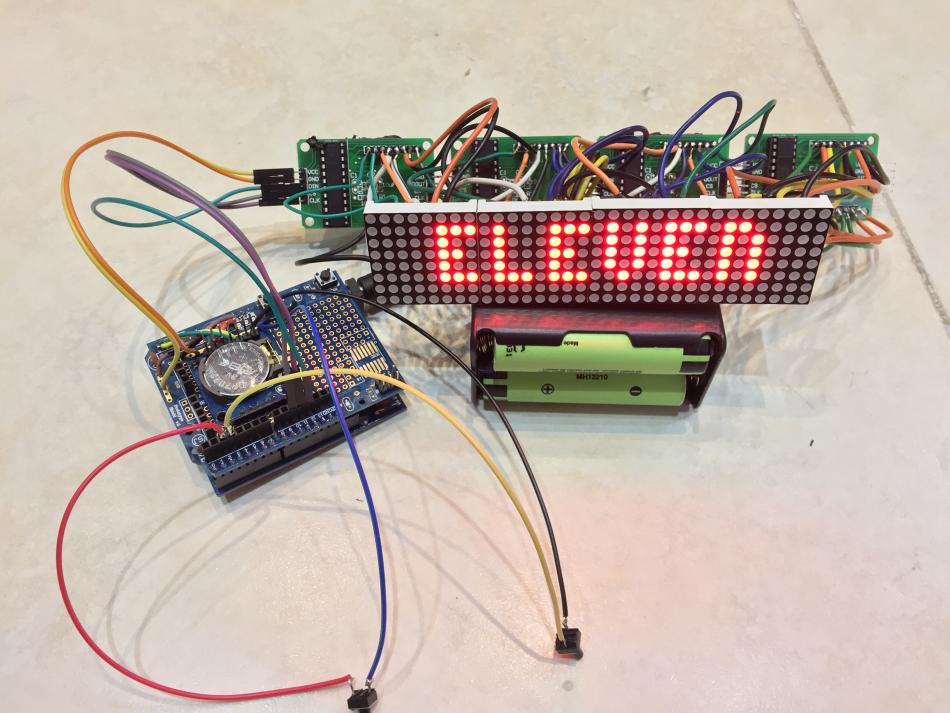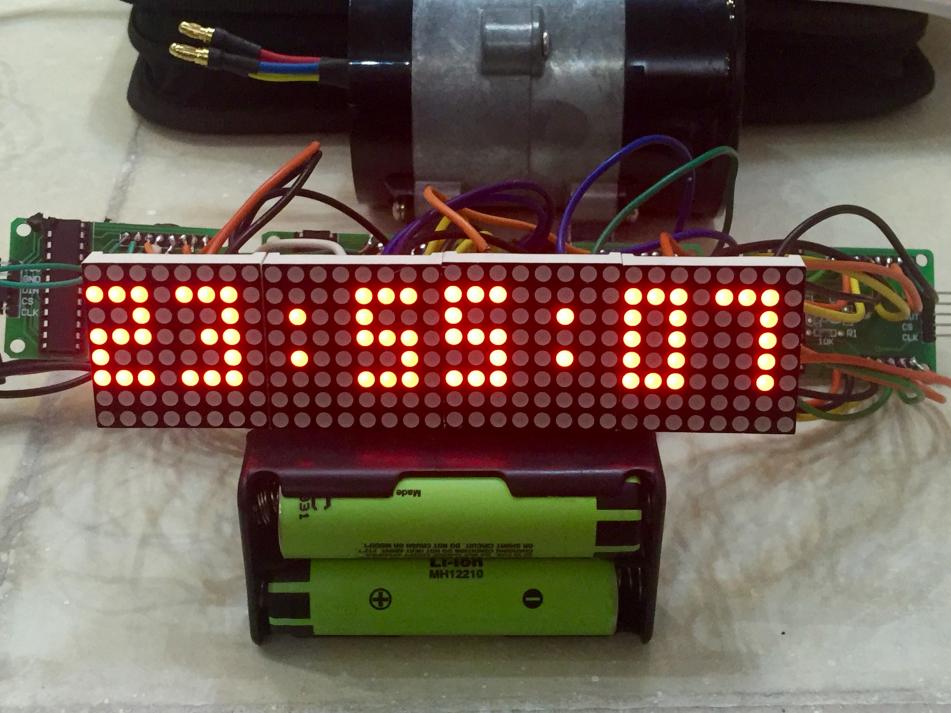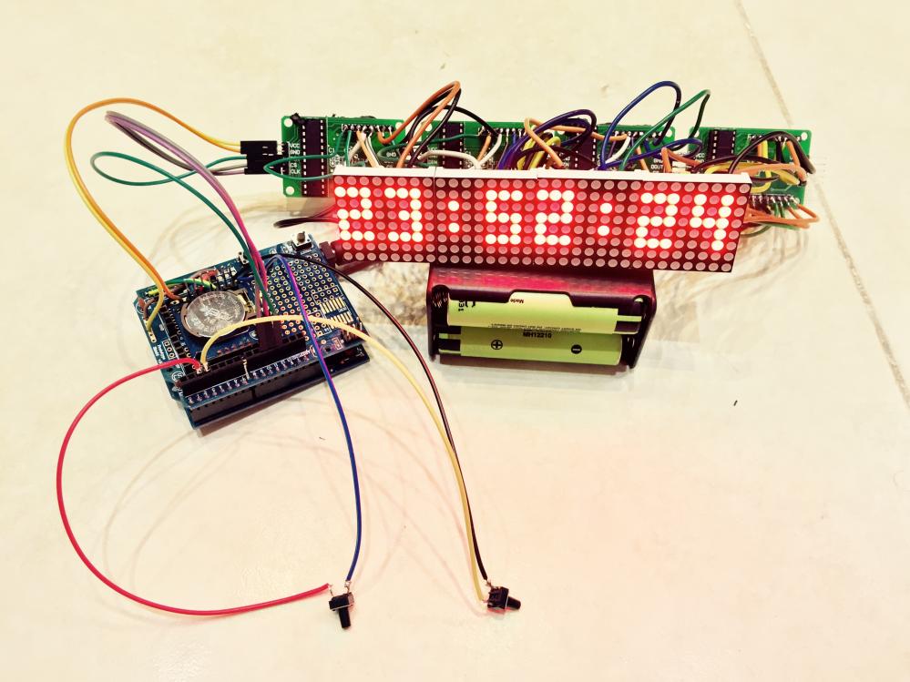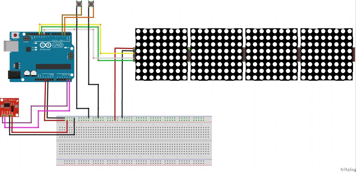 سلام دوستان . ساعتی که امروز میخام بذارم از چهار تا صفحه نمایش ال ای دی ماتریسی MAX7219 یک عدد ماژول ساعت DS1307 اردوینو UNO و شیلد پروتوتایپ آردوینو Uno استفاده شده . این ساعت بسیار زیباست . دوستان توجه کنن نقشه ای که رسم کردم روی شیلد پرتو تایپ نیست ولی راحته اگه طبق راهنمای سیر از تکه سیم استفاده کنید و مثل من ماژول ساعت رو روی شیلد پرتوتایپ نصب و استفاده کنید. دوستان توجه کنن این ساعت منو دار هست . منو هاش ساعت بزرگ ساعت ریز تنظیم ساعت تاریخ و تنظیم نور ماتریکس رو حتی اعلام ساعت با حروف رو داراست!!! فوق العاده زیباست مطمئنا بعد از ساخت و دیدنش خستگی ساختش با یک نگاه از تنتون خارج میشه!! دوستان فقط صفحه ماتریکس رو اگه طبق نقشه لحیم کردین یا وصل کردین به هم حروف و اعداد طبعا چون ماژول طولش یه کم زیاده فاصله بین حروف میوفته اگه مشکلی ندارید که هیچی اگه دارید همه ماتریکس ها رو از برد جدا کنید مثل من و بهم چسب بزنید و بین پایه و برد دونه دونه پایه ها رو سیم لحیم کنید . البته یه مقدار وقت گیر هست ولی بهتون قول میدم می ارزه. دوستان اگه قصد دارن کیس یا جعبه براش بسازن مثل من کلید ها رو بکشید بیرون در غیر این صورت میتونید از دکمه های شیلد پرتو تایپ هم استفاده کنید . دوستان دو کلید داره این ساعت یکی به اسم set و دیگری ok هست کلید set برای رفتن به منو یا تغییر حالت ساعت و کلید ok هم برای تایید و ذخیره . مهم ترین ویژگی این پروژه اینه شما بعد از مونتاژ میتونید با همین دو کلید set و ok سال . روز . ماه. ساعت . دقیقه رو هم تنظیم کنید. بریم سراغ پروژه :