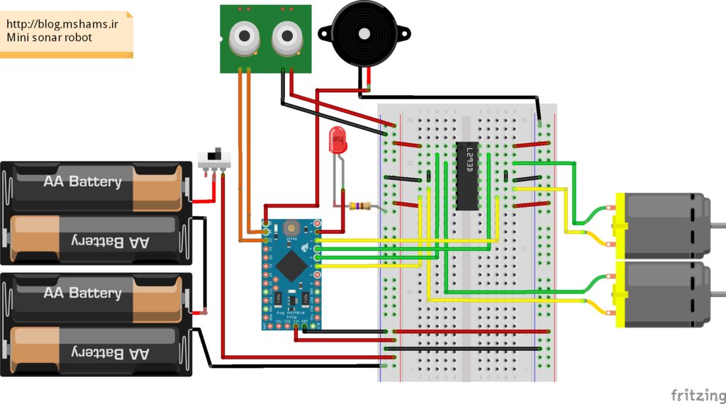 از یک آردوینو پرو مینی 5 ولت و IC L293D جهت درایو موتورها استفاده شده است. به منظور زیبا سازی کار از led و اسپیکر هم استفاده شده، کد و تصاویر به پیوست موجود هستد.