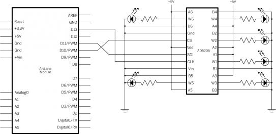پتانسیومترهای دیجیتال وقتی مفید هستند که شما به تغییر مقاومت در یک مدار بصورت الکترونیکی احتیاج دارید نه به وسیله دست. برنامه های کاربردی به عنوان مثال عبارتند از LED کاهنده نور، اصلاح سیگنال های صوتی و تولید تن. در این مثال ما از یک پتانسیومتر شش کاناله برای کنترل روشنایی شش LED استفاده کردیم. مرحله ای که ما می خواهیم برای اجرای ارتباط SPI پوشش دهیم می تواند برای استفاده از اکثر دیگر دستگاههای SPI اصلاح شود.