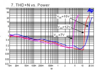 با توجه به نمودار زیر، میبینید که برای تغذیه 7 ولت مثلا، بالای 3 وات توان ، دیستورشن بصورت عمود میره بالا. دیگه پیشبینی کنید برای 5 ولت چی میشه.