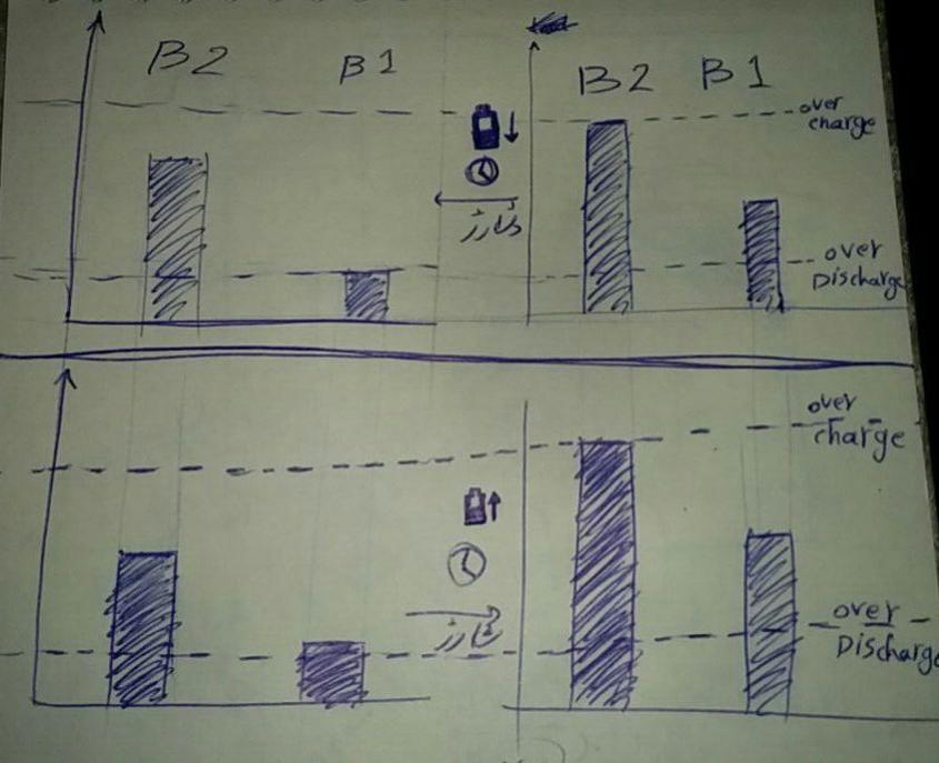 دوتا نمودار بالایی خالی شدن همزمان دو باتری که بالانس نیستند رو نشون میده و کاملا منطقیه که بورد محافظ وقتی فقط یکی از باتری ها شارزش خالی میشه کل مدار رو قطع کنه حتی اگر بقیه باتری ها شارژ داشته باشند ولی موقع شارژ این داستان یکمی فرق میکنه اگر همون دوتا باتری رو بزنیم به شارژ باتری که پر تر هست زود به حداکثر شارژ میرسه درصورتی که اونیکی باتری شاید فقط 30% یا کمتر شارژ شده باشه یعنی دوتا نمودار پائینی .که باعث میشه ما بتونیم فقط از 30% یا کمتر از کل توان باتریمون استفاده کنیم!