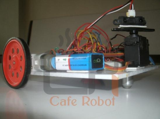 پس از کالیبره کردن سروو می توانیم سنسور فاصله را بر روی آن قرار داده به طوریکه سنسور ناحیه ی مقابل ربات را ببیند و آن را با چسب دو طرفه بر روی سروو ثابت کنیم.