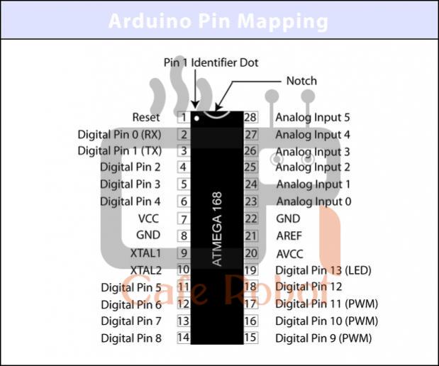 در این مرحله می خواهیم میکروکنترلر ATmega168 خود را برای اینکه کاملا مشابه آردوینو عمل کند آماده کنیم. قبل از شروع اجازه دهید نگاهی به پایه های این میکروکنترلر انداخته و ببینیم آیا رابطه ای بین عملکرد برخی از این پایه ها با پایه های آردوینو وجود دارد یا خیر. اگر به دیتا شیت این میکرو کنترلر نگاهی بیندازید هیچ ارتباطی بین پین های این میکروکنترلر و پین های آردوینو نخواهید یافت زیرا آردوینو از توابع مخصوص به خودش برای هر پین استفاده می کند.