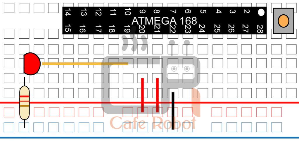 در آردوینو پین شماره 13 مربوط به LED است. برای اتصال LED به میکرو یک مقاومت 220 اهمی را از زمین به کاتد LED وصل کرده و آند GED را به پین شماره 19 میکرو کنترلر وصل نمایید. اتصالات مربوط به یک سمت میکروکنترلر به پایان رسید. حال می توانیم به پین های سمت دیگر میکروکنترلر بپردازیم.