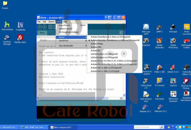 نرم افزار آردوینو را باز نموده و از منوی Example > sketch files > under digital > blink sketch را باز کنید. از منوی tools > serial port پورتی را که در حال استفاده هستید انتخاب نمایید. برای مثال این درگاه ممکن است com1 یا هر com دیگری باشد.