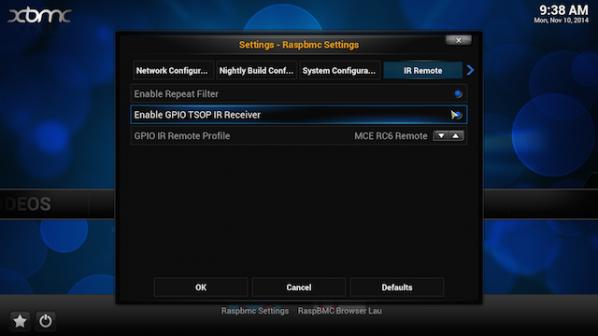 4.برای فعال سازی گیرنده گزینه "Enable GPIO TSOP IR receiver" را انتخاب کنید: