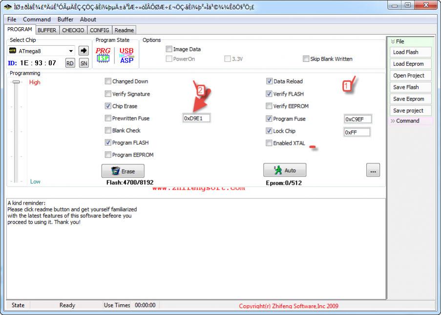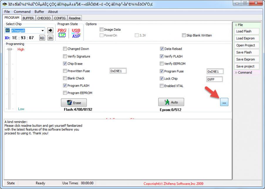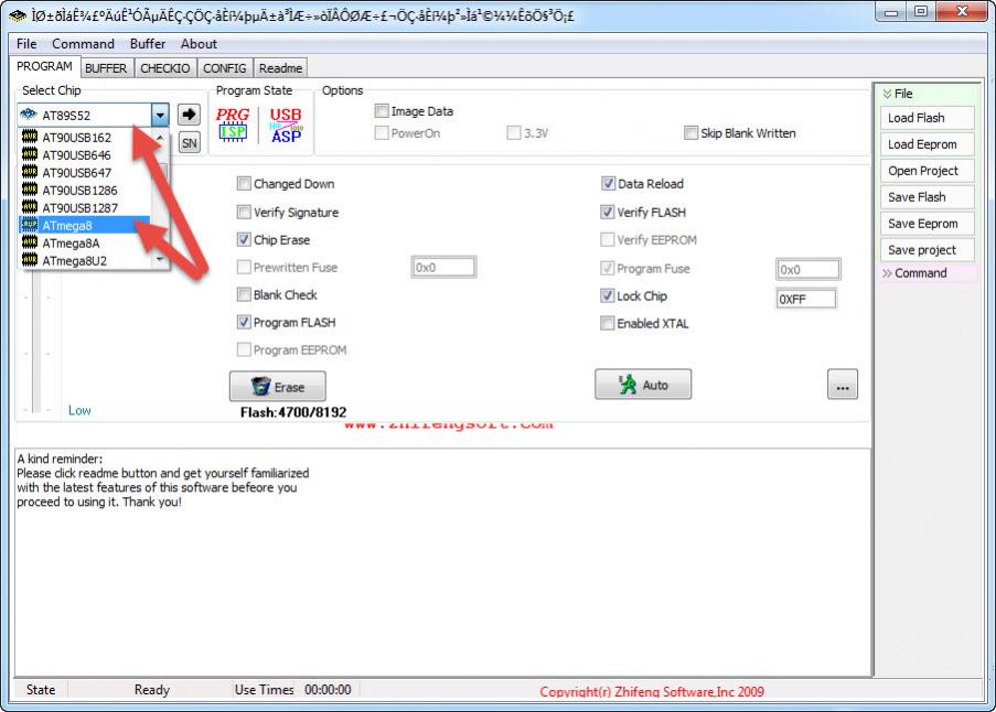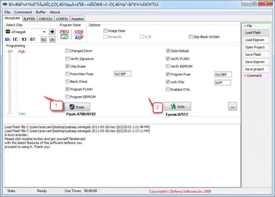بعد از طی کردن این مراحل آماده آپدیت کردن firmware هستیم. برای این کار مطابق عکس زیر ابتدا توسط آیتم erase چیپ را پاک کنید. سپس توسط آیتم auto کد firmware را آپلود کنید.