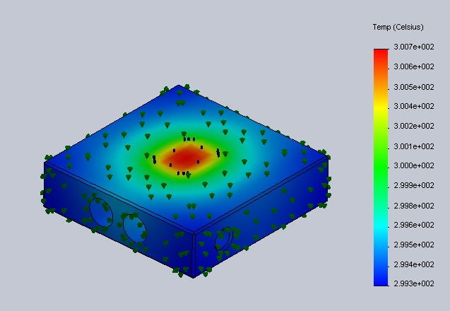 اگر بک قطعه الکترونیکی دارای توان اتلافی 5 وات باشد و یک بلوک آلمینیومی (1060) متصل شود تنها راه خنک شدن آن چهار وجه بلوک است که با صرف نظر از مقاومت های رسانیی فایل بالایی اگر انتقال حرارت آزاد بطور خوشبینانه برابر با 5 پنج با واحده w/K.m2 باشد آنگاه مطابق با عکس زیر تمامی بلوک حدودا برابر با 300 درجه سلسیوس خواهد شد و برای کاهش دما ناچار به افزایش سطح خواهد بود.
