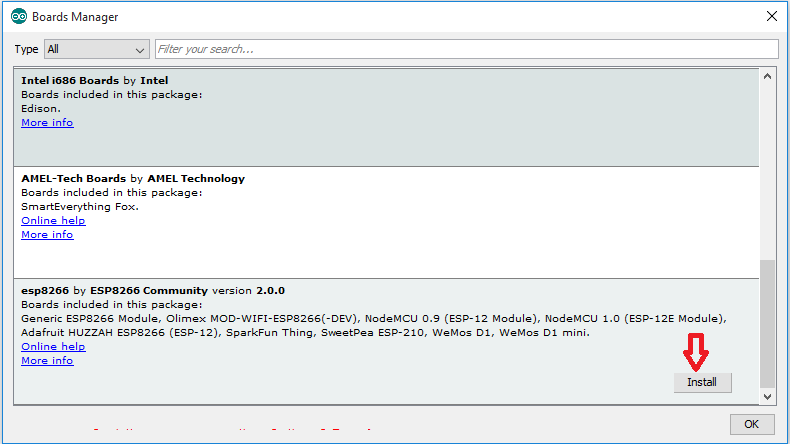 5.در صفحه باز شده به انتهای لیست بروید و ESP8266 and ESP8266 community را نصب کنید. حجم فایل بیش از 150 مگ می باشد.