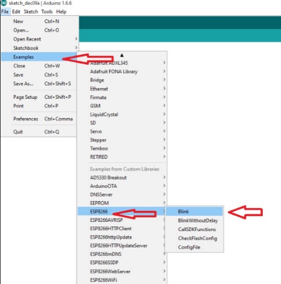 7.در منوی File > Examples > ESP8266 > Blink را انتخاب کنید: