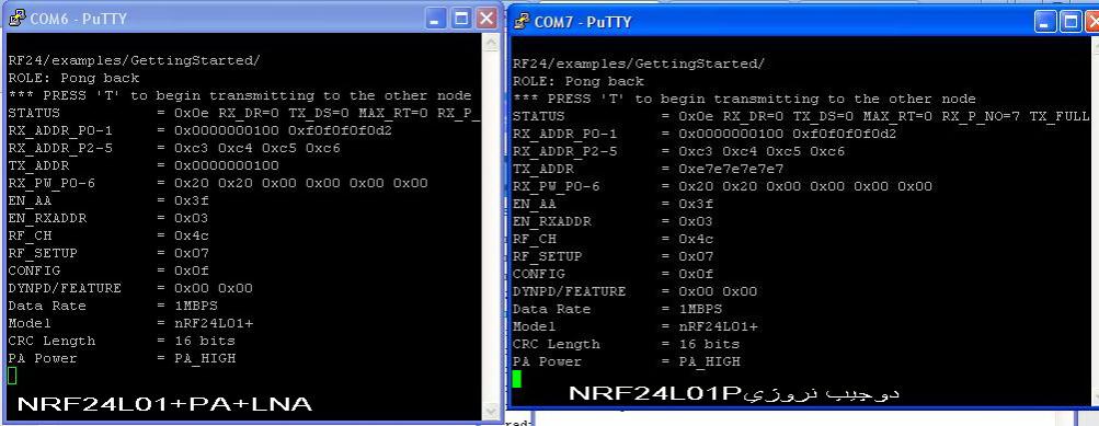 سلام دوستان کسی میتونه راهنمایی کنه من از افتاب رایانه ماژول ماژول NRF24L01+PA+LNA - برد 1 کیلومتر و ماژول NRF24L01P دو چیپ ،اصلی، نروژی با برد 1000 متر گرفتم برای راه اندازی این دو برد از مثال "Hello World" لینکشم میذارم براتون استفاده کردم و کاملا سیم بندی درسته فقط این نتایج برام حاصل شد وقتی NRF24L01+PA+LNA فرستنده میکنم و ماژول NRF24L01P دو چیپ ،اصلی، نروژی گیرنده کار نمیکه !! وقتی جای این دو تارو عوض میکنم کاملا درست کار میکنه مشکل از چیه ؟؟؟؟؟؟؟؟؟؟؟؟؟؟؟ اصولا هر دو ماژول هم در مد فرستنده و گیرنده کار کنن ولی ماژول NRF24L01+PA+LNA در مد فرستنده کار نمیکنه!!!!!!!!
