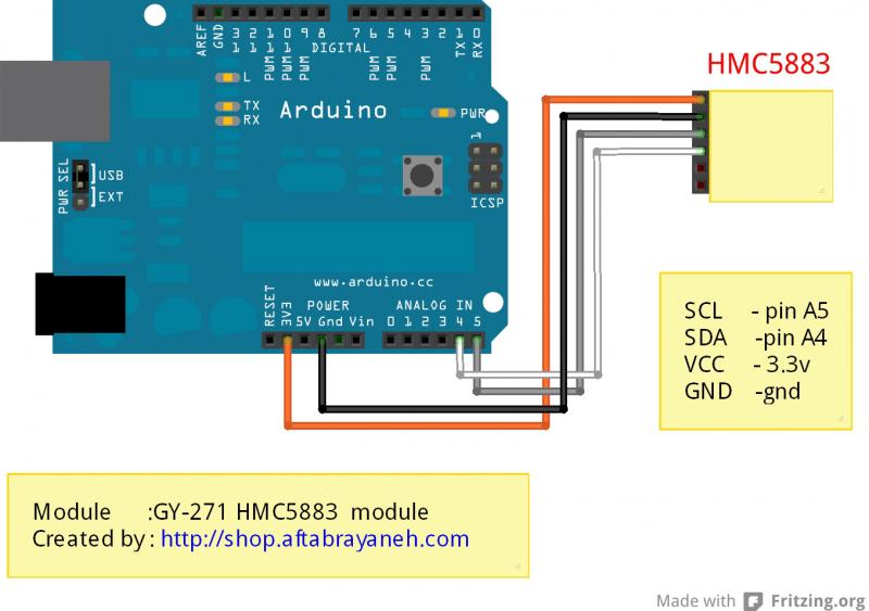 HMC5883 محصول Honeywell يك قطب نماي 3 محوره ديجيتال است كه ميتواند شدت ميدان مغناطيسي تا 8± گاوس را با دقت 5 ميلي گاوس اندازه گيري نمايد. توسط اين ماژول ميتوان به دقت 1 تا 2 درجه در جهت يابي و ناوبري رسيد. اين ماژول از طريق رابط I2C به آردوينو متصل ميشود. ولتاژ تغذيه اين ماژول 2.16 تا 3.6 ولت ميباشد، كه توصيه ما استفاده از ولتاژ 3.3 ولتي برد آردوينو ميباشد. جريان مصرفي HMC5883 تنها 100 ميكرو آمپر ميباشد.