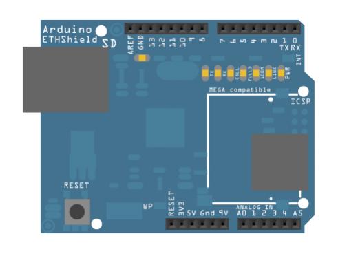 این شیلد جهت اتصال برد آردوینو شما به شبکه اینترنت میباشد.تنها با وصل کردن ماژول به برد آردوینو و اتصال به شبکه توسط یک کابل اترنت استاندارد RJ45 و بکارگیری چند دستور ساده در کامپایلر آردوینو می توانید جهان پیرامون خود را از طریق اینترنت کنترل کنید.این شیلد با استفاده ازچیپ Wiznet W5100 اینترنت را به آردوینو به ارمغان می آورد.Wiznet W5100 یک شبکه (IP) با امکان TCP و UDP فراهم می کند. از چهار اتصال همزمان سوکت پشتیبانی می کند. با استفاده از کتابخانه Ethernet می توانید برنامه اتصال به اینترنت را از طریق شیلد بنویسید. این برد دارای شکاف SD-card است که می تواند برای ذخیره فایل ها برای سرو کردن در شبکه مورد استفاده قرار گیرد. این شیلد همچنین دارای یک کنترلر ریست برای اطمینان از اینکه ماژول در هنگام روشن شدن به درستی ریست شده است می باشد .نسخه های قدیمی این شیلد فاقد سازگاری با بردهای مگا بوده و نیاز به ریست دستی بعد از روشن شدن می باشند.