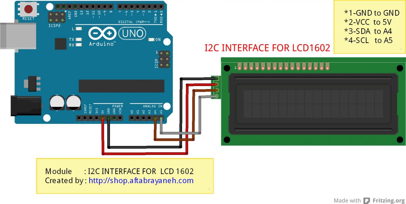 به منظور اتصال lcd كاراكتري معمولي به بورد آردوينو به 6 پين ديجيتال نياز داريم ، در صورتي كه با استفاده از رابط I2C ، تنها با استفاده از 2 پين ديجيتال ميتوانيم lcd را راه اندازي كنيم. توسط پتانسيومتر روي برد ميتوان كنتراست lcd را تنظيم كرد.