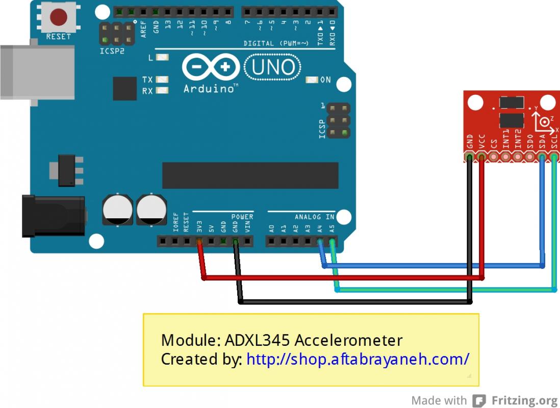 مثال زیر چگونگی اتصال ماژول ADXL345 به آردوینو و نحوه راه اندازی آن را نشان می دهد.