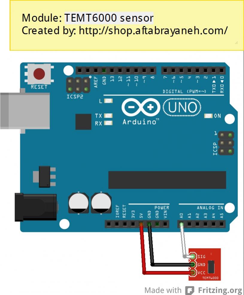 مثال زیر اتصال سنسور TEMT6000 را به آردوینو نشان می دهد و مقدار روشنایی از 0 تا 1023 در sreial monitor نمایش داده می شود.