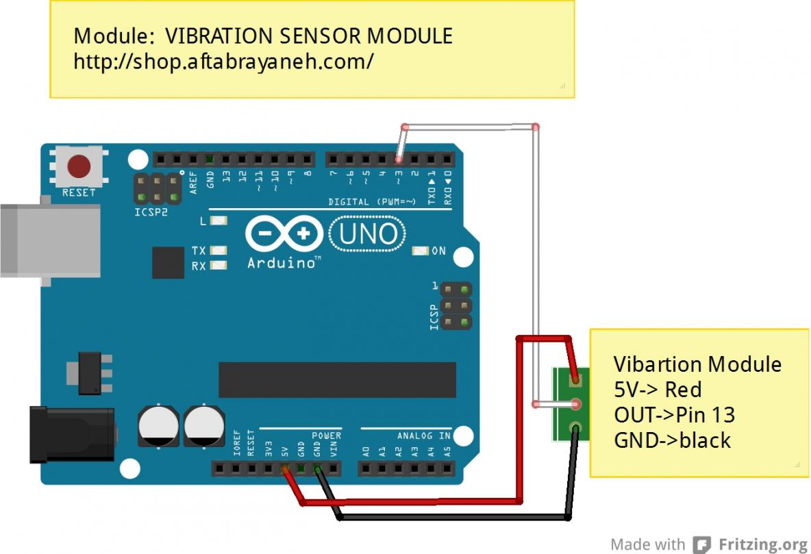 در مثال زیر با ایجاد لرزش بر روی ماژول LED پین 13 روشن میشود