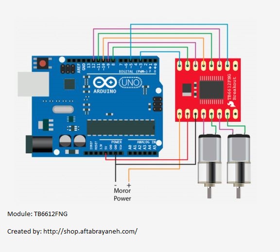 مثال زیر کنترل دو موتور DC از طریق ماژول TB6612FNG متصل به آردینو را نشان می دهد.