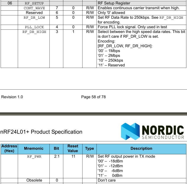 و در مورد "قسمت دوم یا همان 07 در این مثال مقدار رجیستر RF_SETEP در چیب NRF24 می باشد" با توجه به کاتالوگی که من در اختیار دارم با ادرس 06 مقدار رجیستر RF_SETEP را میتوان تغیر دارد لطفا توضیح دهید.