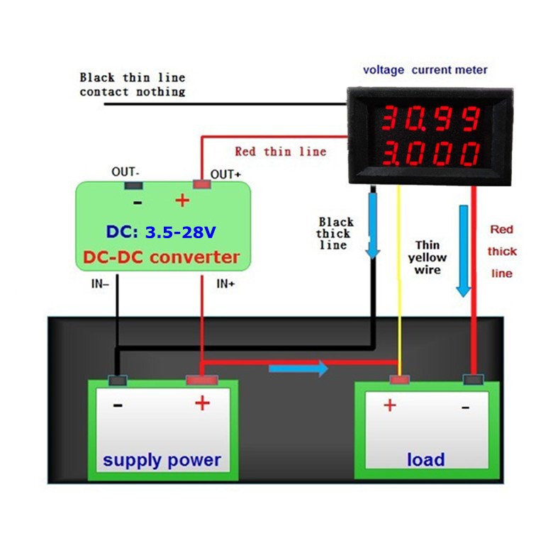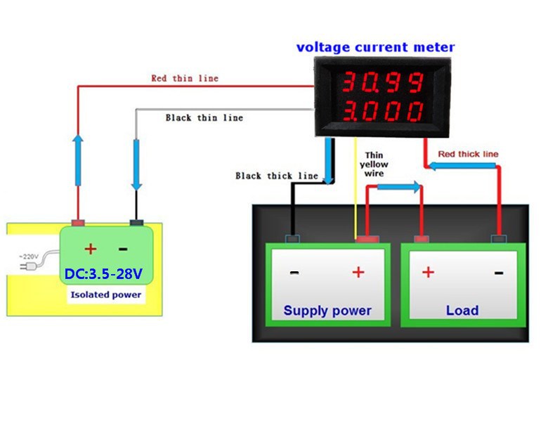 Red thin wire (VCC): Power input+ 3.5-28V (NOTE: If the measuring signal is lower than 28V and have abundant power supply, it can be used as power supply for the module [black wire and yellow wire are contacted together to use])