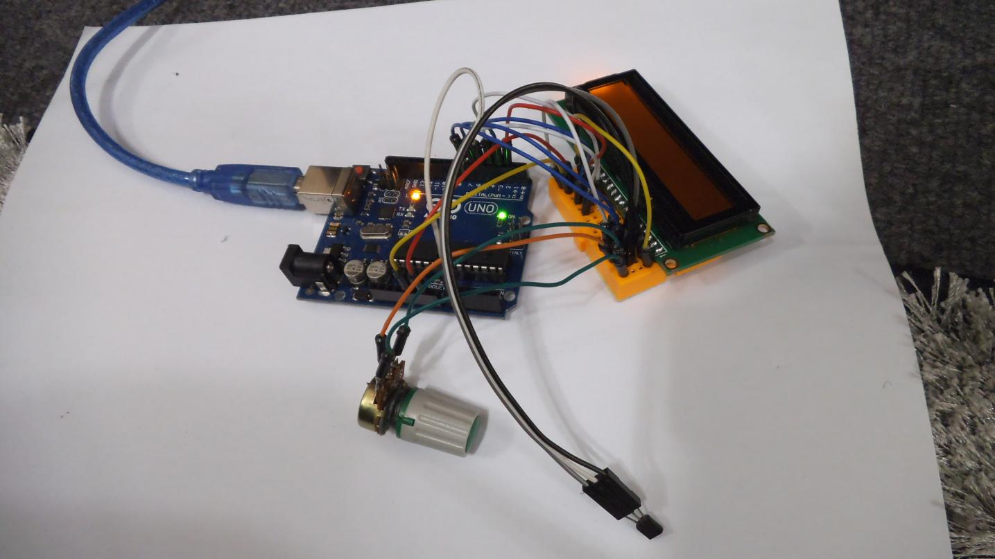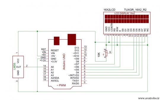 نمایشگر LCD کاراکتری 16x2 دارای تم مشکی و رنگ نوشته) و خواستم برنامه ی دما سنج رو ، رو ی برد UNO با دماسنج LM35 اجرا کنم ، برنامه بدون مشکل در کامپایلر اجراشد .