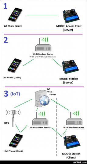 بنده میخوام با آردینو mega 2566 و ماژول esp8266 یک ارتباط درست بکنم به صورتی که ماژول به روتر وصل شود و با استفاده از یک ای پی در مرورگر کامپیوتر وارد کنم و از آنجا اطلاعاتی را تغییر بدهم و همین اطلاعاتی از اینترنت در یافت کرده و به مدار بفرستم مانند نمونه 2 در عکس زیر