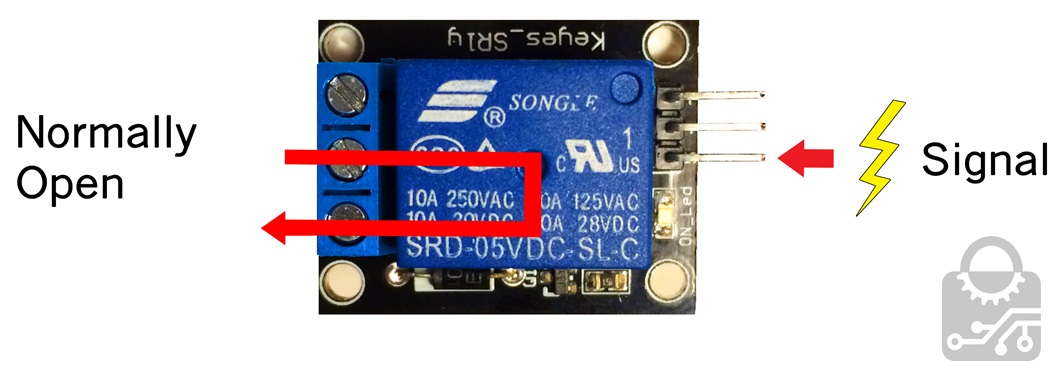 با توجه به عکس می بینیم که ورودی رله ی مورد نظر ما 3 کانکتور (زمین / 5 ولت / سیگنال) است. کانکتور زمین و 5 ولت همیشه متصل و دارای جریان است. اما پورت سیگنال توسط آردویینو مدیریت می شود و با گرفتن سیگنال از آردویینو رله را کنترل می کند.