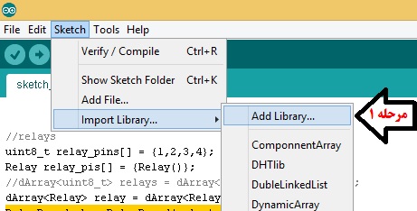 نحوه نصب این کتاب خانه ها رو همه شما بخوبی بلد هستید ولی کسانی که نمیدونن این ها رو چطور به IDE آردینو معرفی کنن مانند تصاویر زیر باید عمل بکنن:
