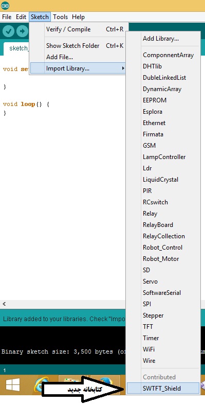 به منوی Sketch رفته و زیر منوی Import library رو باز کنید همونطور که میبینید کتابخانه جدید در انتهای منو در قسمت Contributed افزوده شده: