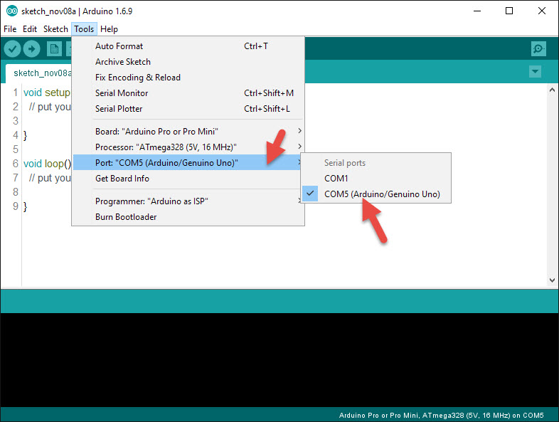 پورت کامی که به برد تخصیص داده رو موقع آپلود انتخاب کردید؟