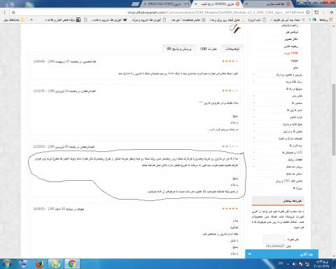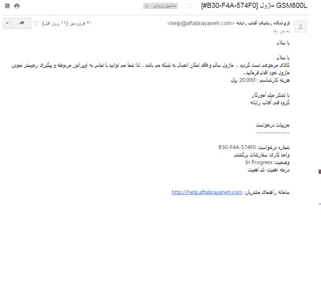تصویر پاسخ شرکت افتاب رایانه به موضوع خرابی ماژول سیم 800که بیانگر بی توجهی به حقوق م