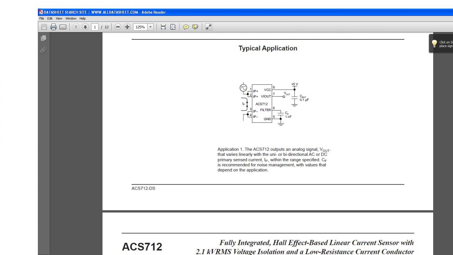 Acs712elctr-30A محصول allegro توانايي اندازه گيري جريان هاي AC ويا DC تا 30 آمپر را دارا ميباشد. ولتاژ خروجي اين سنسور متناسب با جريان عبوري از آن بوده و اين رابطه كاملا خطي است .همچنين ورودي و خروجي اين سنسور از نظر الكتريكي كاملا از يكديگر ايزوله ميباشد. ولتاژ خروجي 66mv±4.5%/A ميباشد.